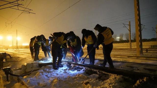 图为应对寒潮天气,朔黄铁路神池南站的员工正在进行除雪作业