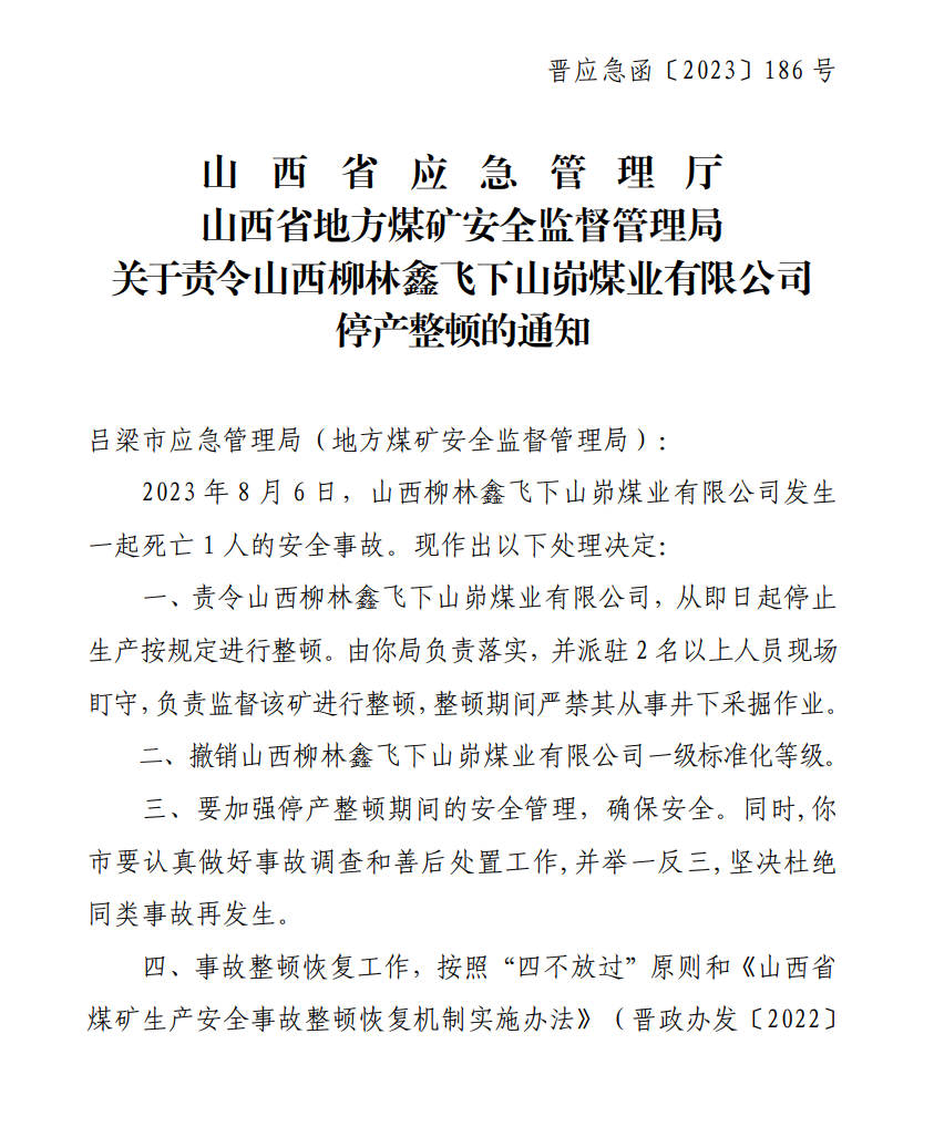 8月6日,山西柳林鑫飞下山峁煤业有限公司发生一起死亡1人的安全事故。责令山西柳林鑫飞下山峁煤业有限公司,从即日起停止生产按规定进行整顿。由吕梁市应急管理局负责落实,并派驻2名以上人员现场盯守,负责监督该矿进行整顿,整顿期间严禁其从事井下采掘作业。同时,撤销山西柳林鑫飞下山峁煤业有限公司一级标准化等级。
