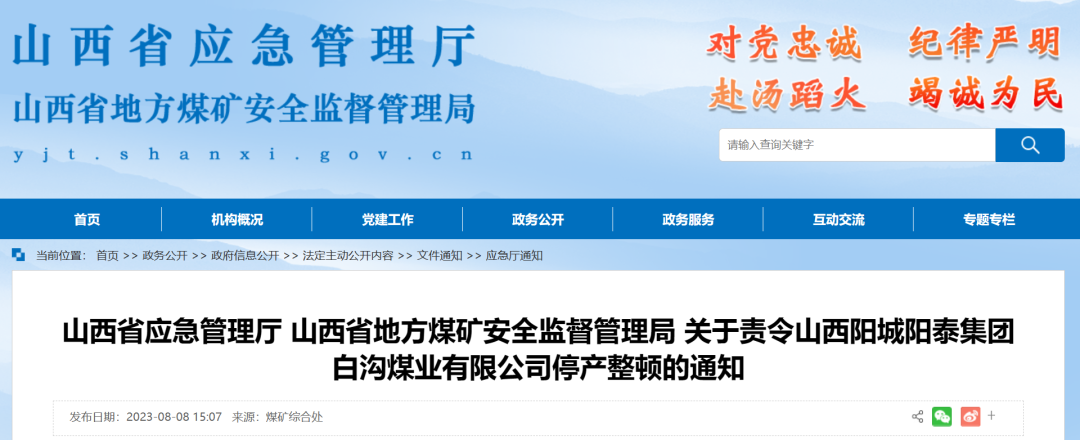 8月8日,山西省应急管理厅、山西省地方煤矿安全监督管理局发布《关于责令山西柳林鑫飞下山峁煤业有限公司停产整顿的通知》以及《关于责令山西阳城阳泰集团白沟煤业有限公司停产整顿的通知》。