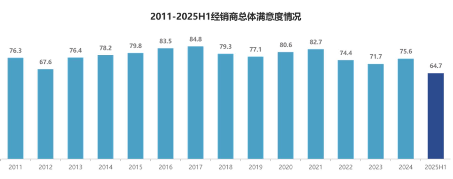重压之下,2025年上半年,汽车经销商对主机厂的满意度再度下滑。调查结果显示,汽车经销商的总体满意度得分为64.7分,较2024年底得分大幅下降。
