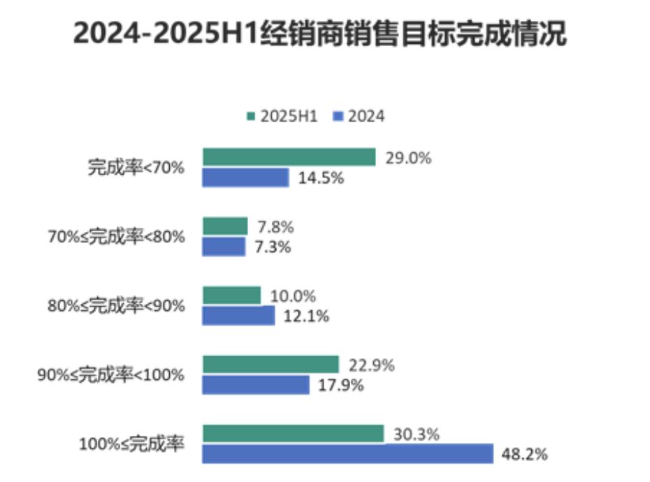 调查结果显示,2025年上半年,仅30.3%的经销商完成销售目标,目标完成率低于70%的经销商占比29.0%,目标完成率高于70%不足100%的经销商占比40.7%。分品牌组来看,豪华品牌目标完成率略好于合资品牌和自主品牌。