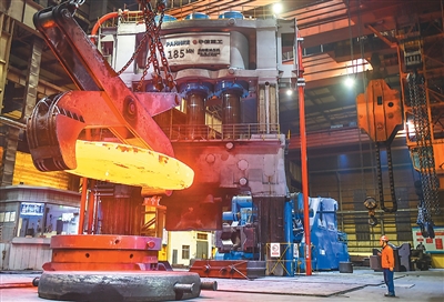 近年来,河南省洛阳市积极支持引导当地矿山装备、节能环保装备等制造业龙头企业提升产业链自主化水平,推动制造业高端化、智能化、绿色化转型。图为位于洛阳市涧西区的中信重工锻压车间内,工人正在锻压一批直径超6米的超大型高端铸锻件产品。黄政伟摄(人民视觉)