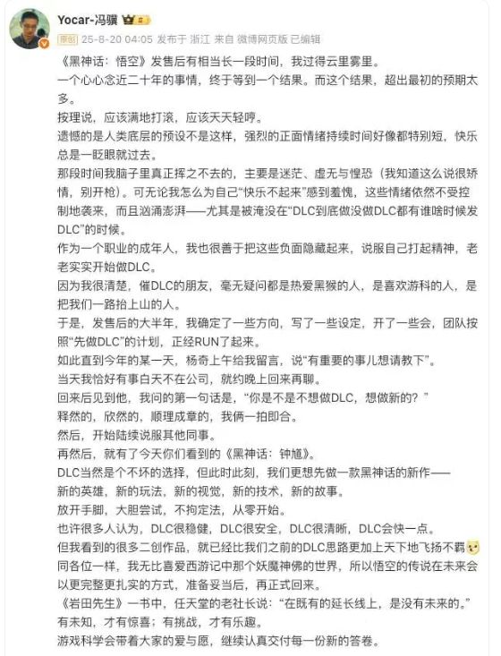 游戏科学创始人、CEO,《黑神话:悟空》制作人冯骥发文解释为何推出新作。他表示,《黑神话:悟空》发售后有相当长一段时间,他过得云里雾里。DLC当然是个不坏的选择,但此时此刻,他们更想先做一款黑神话的新作——新的英雄,新的玩法,新的视觉,新的技术,新的故事。他补充说,“悟空的传说在未来会以更完整更扎实的方式,准备妥当后,再正式回来。”