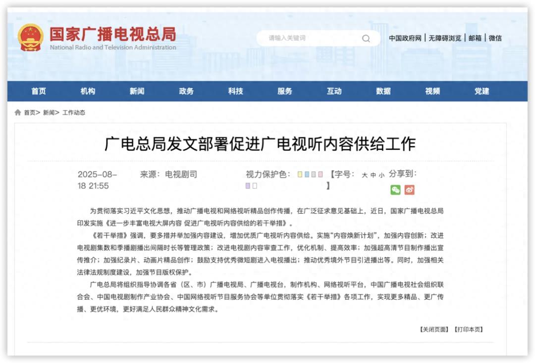 据广电头条,“广电21条”强调,要多措并举加强内容建设,增加优质广电视听内容供给。实施“内容焕新计划”,加强内容创新;中插广告不再禁止,试点实行电视剧中插广告政策,经总局批准后,电视台可实施每集电视剧中间插入一次不长于30秒的剧情或商业广告;改进电视剧集数和季播剧播出间隔时长等管理政策;改进电视剧内容审查工作,优化机制、提高效率;加强超高清节目制作播出宣传推介;加强纪录片、动画片精品创作;鼓励支持优秀微短剧进入电视播出;推动优秀境外节目引进播出等。同时,加强相关法律法规制度建设,加强节目版权保护。