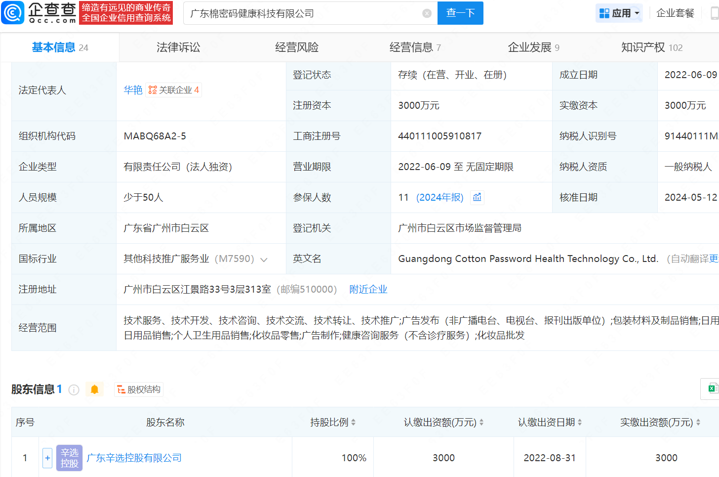 企查查APP显示,广东棉密码健康科技有限公司成立于2022年6月,法定代表人为华艳,注册资本3000万人民币,由广东辛选控股有限公司全资持股,辛有志(辛巴)为该公司实际控制人。企查查信息显示,该公司曾于2023年申请“一种抑菌效果好的樱花卫生巾”专利,摘要显示该专利抑菌纤维层能有一定的抑菌、抗病毒、镇痛和护肤作用。此外,今年1月,辛巴实控的广州辛选网络信息科技有限公司因其主播在直播带货过程中,存在夸大宣传、虚构商品功能性能等欺骗、误导消费者的违法行为,被广州市白云区市场监督管理局罚款175万元。