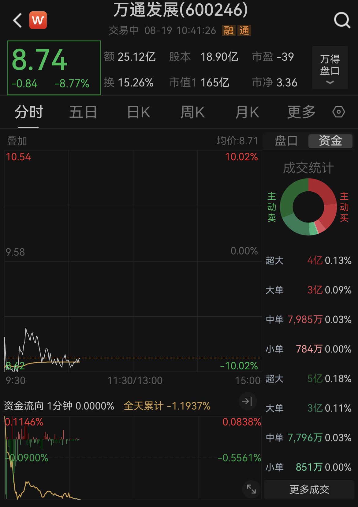 值得注意的是,在上述利空公告发布前,万通发展已现异动。8月18日早盘,万通发展开盘跳水,迅速触及跌停板,成为当日上午,唯一跌停的非ST股票。
