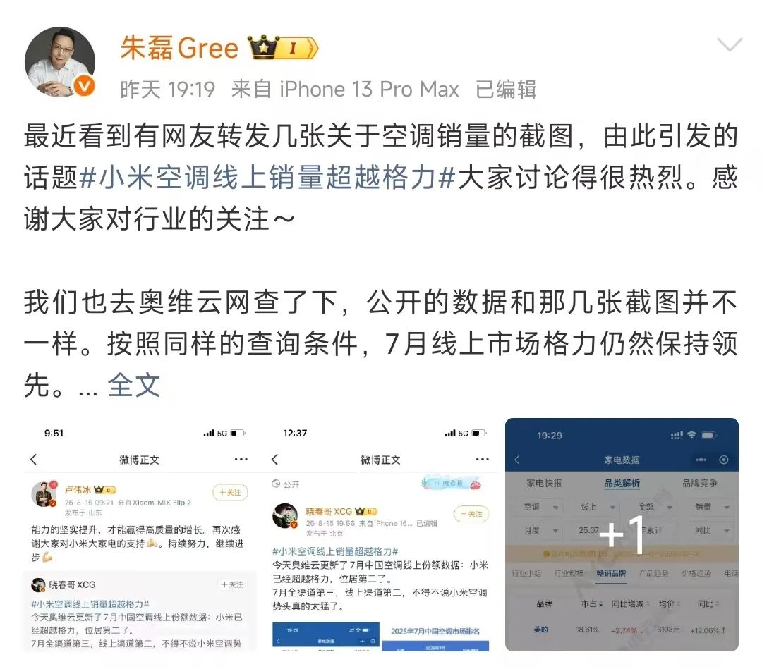 8月18日晚,格力电器市场总监朱磊在微博上发文反击“小米空调线上销量超越格力”说法,称“我们也去奥维云网查了下,公开的数据和那几张截图并不一样。按照同样的查询条件7月线上市场格力仍然保持领先。”