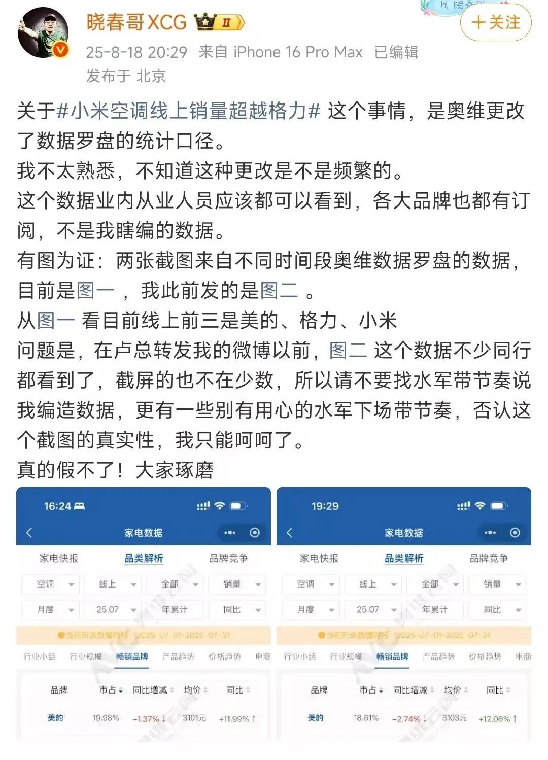 对此,卢伟冰转发信息的原博主“晓春哥XCG”回应称:“这个事情,是奥维更改了数据罗盘的统计口径。”