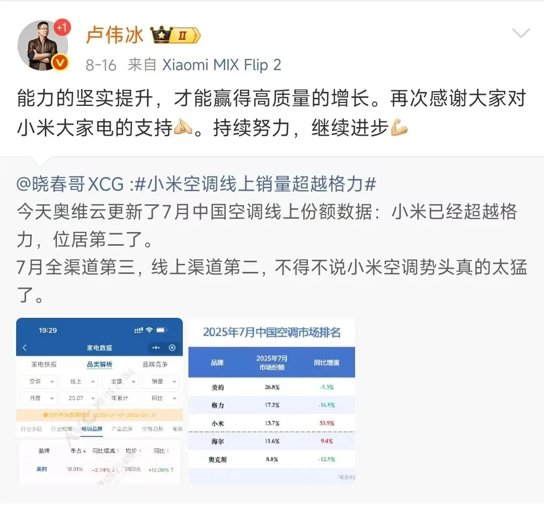 彼时,小米集团合伙人、总裁卢伟冰曾微博发文疑似回应该事,他表示,“今天上午刚刚开了大家电的业务例会,重点看了看空调业务的销量和份额。根据第三方统计数据,1-11月小米空调销量同比增长53%。”王化转发这条微博时称:“大家都知道我们的大家电工厂已经动工了,明年我们就能自研自产小米空调了”。