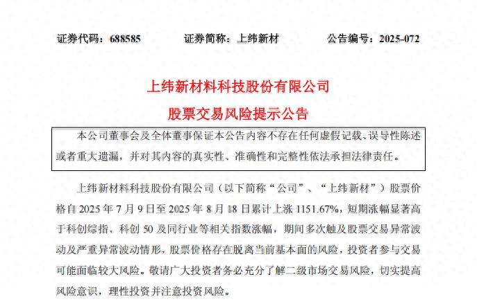 8月19日,经历30天连涨,一度冲上此前15倍股价的上纬新材官方就近期股价交易波动发布风险提示,称公司基本面未发生重大变化,但近期公司股票交易价格已严重脱离公司目前的基本面情况,投资者参与交易可能面临较大的市场风险。