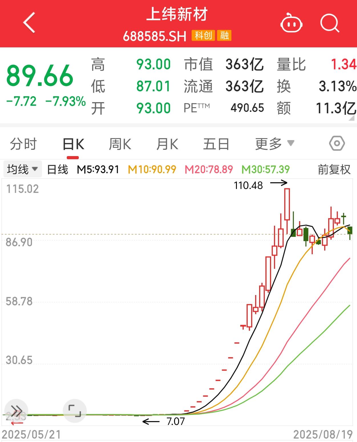 截至8月19日下午发稿,上纬新材股价跌7.93%,报89.66元/股。