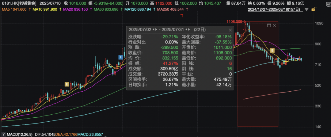 同样是7月,老铺黄金的股价表现却让投资者“揪心”,一个月内跌近30%。