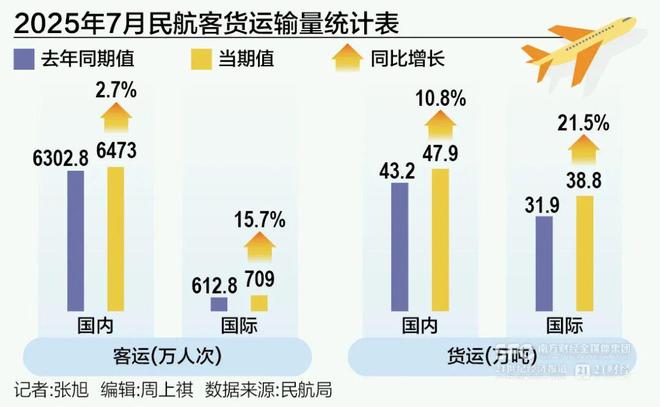 民航局近日公布的数据显示,客运方面,7月国内航空市场完成旅客运输量6473万人次,同比增长2.7%。国际航线完成旅客运输量709万人次,同比增长15.7%,规模创历史新高。