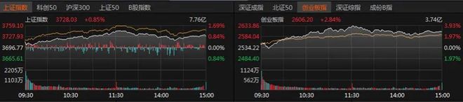 沪指盘中一度冲至3745.94点,创十年新高,最终收涨0.85%报3728.03点;创业板指收涨2.84%报2606.2点,突破去年10月8日2576.22点的高点;深证成指收涨1.73%。沪深300、上证50微涨,科创50涨幅超过2%,北证50涨近7%。