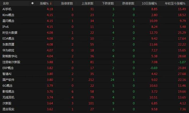 Kimi概念、时空大数据、东数西算、财税数字化、注册制次新股、智谱AI、国产软件、影视概念也大涨。