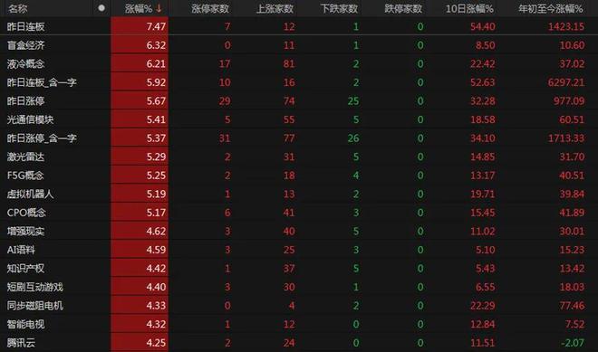 液冷概念涨幅超过6%,光通信模块、激光雷达、F5G概念、虚拟机器人、CPO概念涨幅均超过5%,AI语料、知识产权、同步磁阻电机、AI手机概念板块均表现不错。