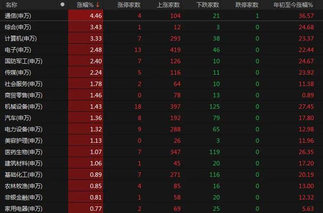 31个申万一级行业中,仅石油石化、房地产板块微跌。14个板块涨幅超过1%,通信板块以4.46%涨幅领先全场,德科立、锐捷网络、剑桥科技、东信和平涨停;综合、计算机板块涨幅超过3%,亚泰集团涨停,科创信息、大智慧、淳中科技、华胜天成、中科金财、智微智能、中安科也纷纷涨停。