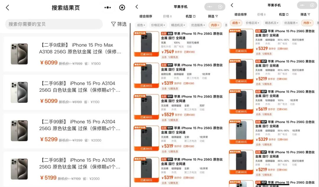 iPhone 15 Pro售价对比:左一为闪回有品;左二、三为爱回收