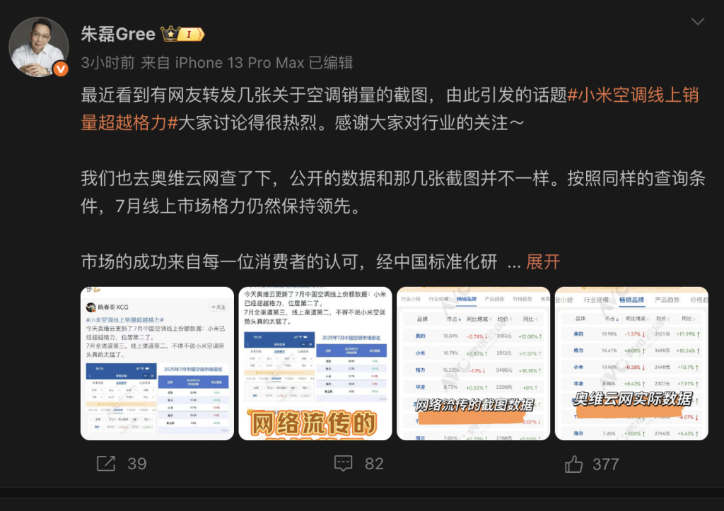 8月18日晚,格力电器市场总监朱磊在微博上发文反击“小米空调线上销量超越格力”说法,称“我们也去奥维云网查了下,公开的数据和那几张截图并不一样。按照同样的查询条件7月线上市场格力仍然保持领先。”