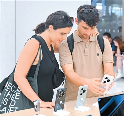 今年上半年,上海海关共验核离境退税申请单6.4万票,比去年同期大幅增长1.4倍。图为7月17日,两名西班牙游客在位于上海市南京路步行街的华为商店里浏览手机产品。新华社记者 陈浩明摄