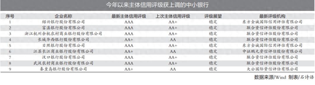 据统计,今年以来已有9家银行获评级机构上调主体信用评级。具体来看,联合资信对富滇银行、浙江杭州余杭农商行、汉口银行、武汉农商行的主体信用评级从AA+调高至AAA,对长城华西银行的主体信用评级由AA上调至AA+;东方金诚对绍兴银行、日照银行的主体信用评级从AA+调高至AAA;中证鹏元资信对江苏长江商业银行的主体信用评级、大公国际资信对秦皇岛银行的主体信用评级分别由AA上调至AA+。