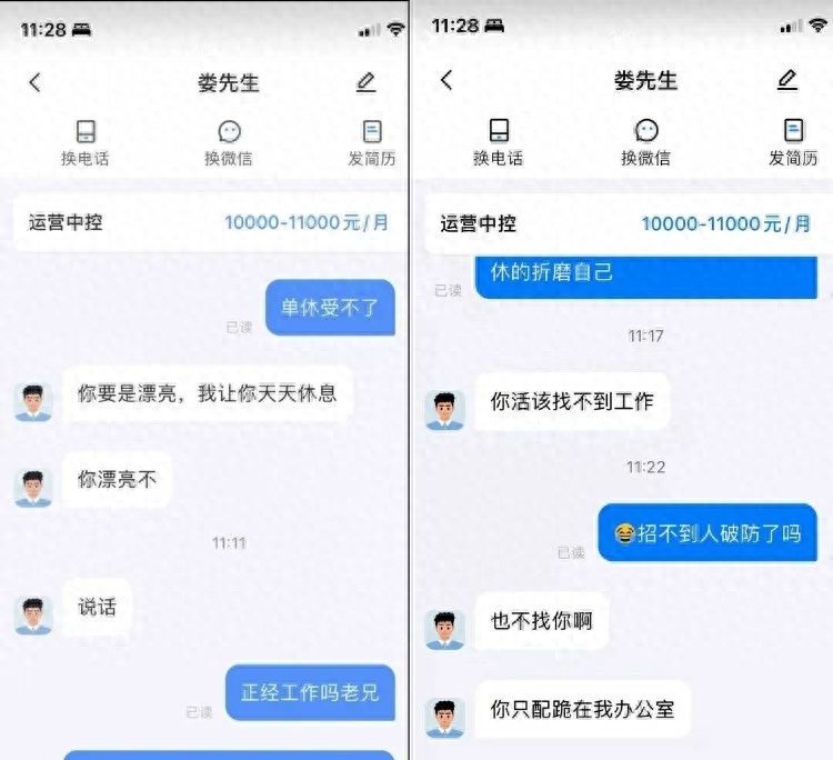 当事人发布的聊天记录显示,在其提出“受不了单休”“目前工作是双休,犯不着找个单休折磨自己”后,对方回复,“你要是漂亮,我让你天天休息”并以“活该找不到工作”进行嘲讽,更称当事人“只配跪在办公室”。相关言论引发网友热议。