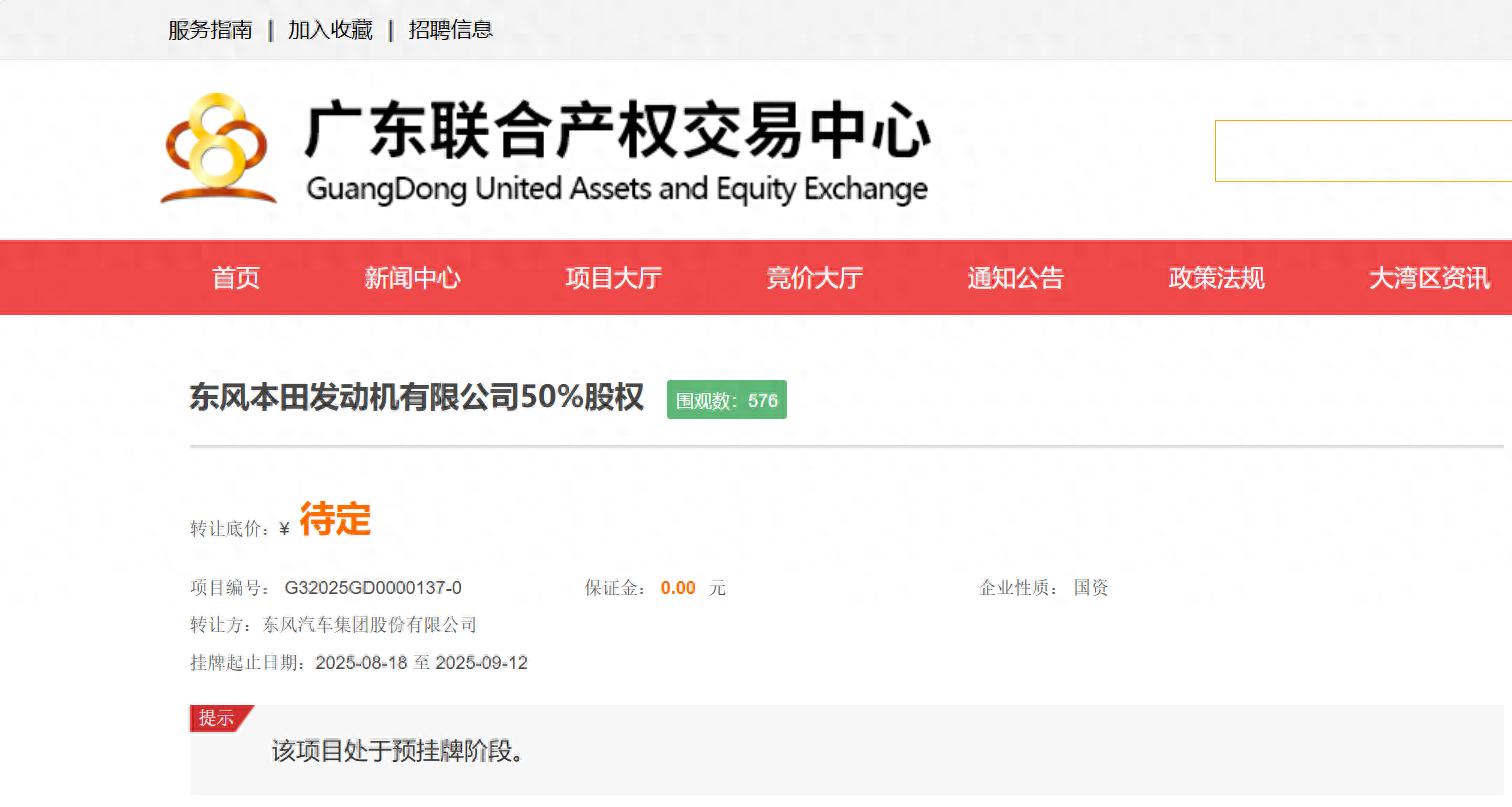 8月18日,广东联合产权交易中心披露,东风汽车集团股份有限公司(以下简称“东风汽车集团”)拟出售东风本田发动机有限公司(以下简称“东风本田发动机”)50%股权。