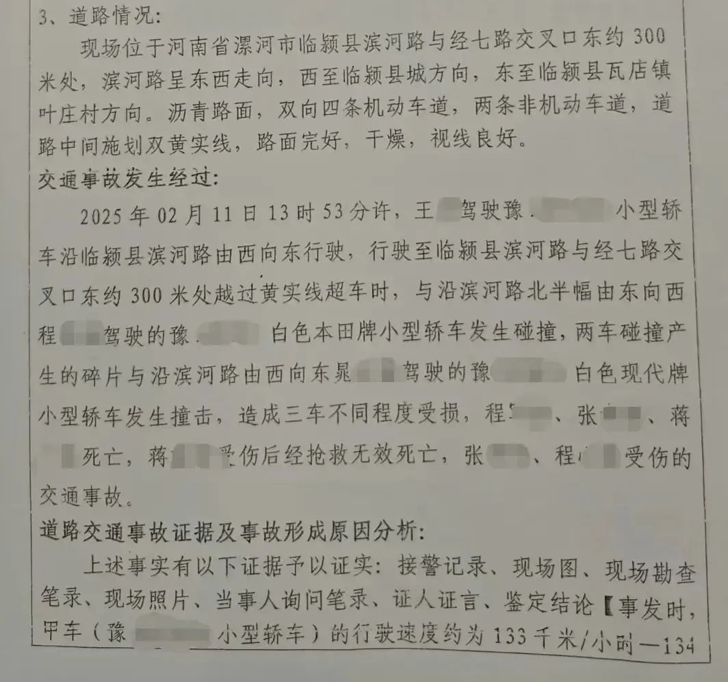 事故责任认定书表述:2025年2月11日13时53分许,28岁王某驾驶蓝色小米轿车沿临颍县滨河路由西向东行驶,行至临颍县滨河路与经七路交叉口东约300米处时,贸然越过黄实线强行超车,与白色本田轿车发生碰撞。两车碰撞产生的碎片,又与白色现代轿车发生撞击,造成三车不同程度受损。事故导致四人死亡、两人受伤。