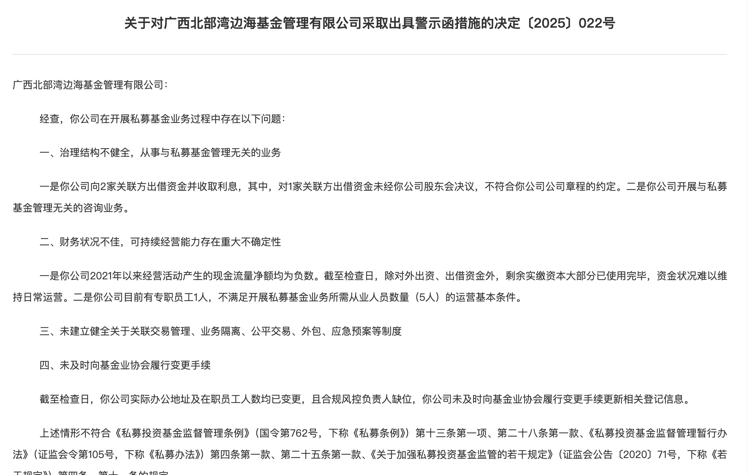 8月18日,中国证券会广西监管局发布关于对广西北部湾边海基金管理有限公司采取出具警示函措施的决定〔2025〕022号。