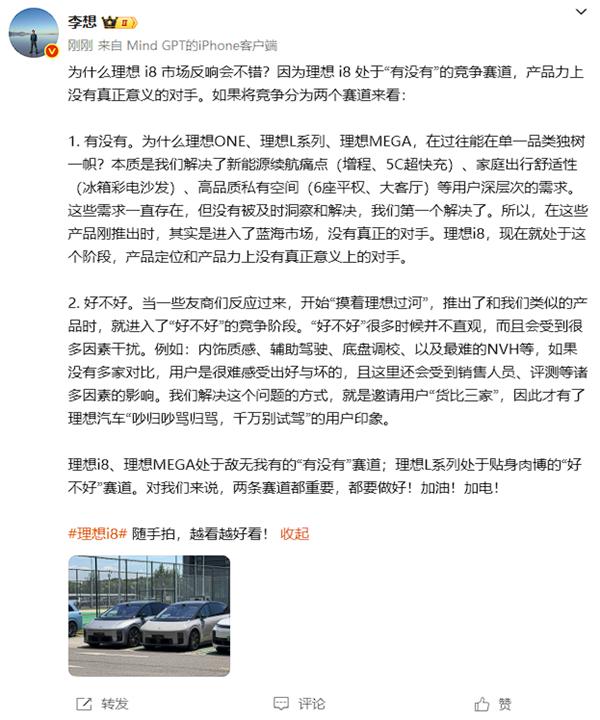 今日下午,理想汽车CEO李想发布微博表示:为什么理想i8市场反响会不错?因为处于“有没有”的竞争赛道,产品力上没有真正意义的对手。