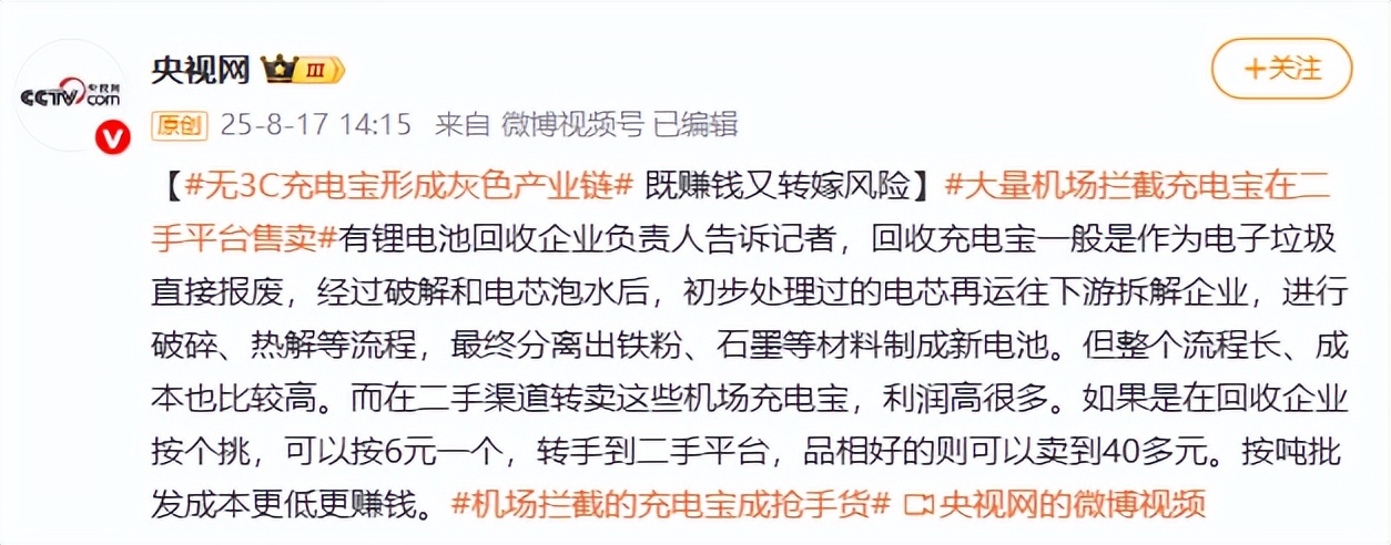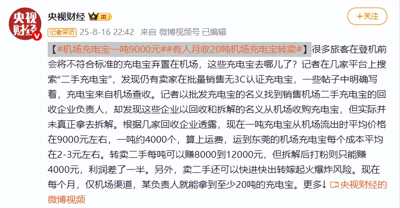 据央视财经,记者以批发充电宝的名义找到销售机场二手充电宝的回收企业负责人,却发现这些企业以回收和拆解的名义从机场收购充电宝,但实际并未真正拿去拆解。
