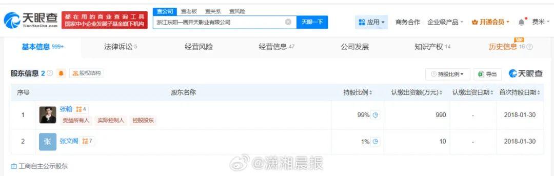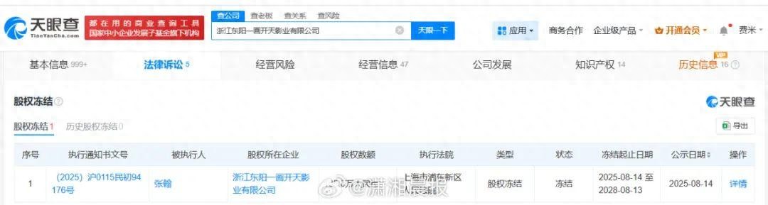 据潇湘晨报报道,记者查询天眼查天眼风险信息发现,近日,浙江东阳一画开天影业有限公司新增一则股权冻结信息,被执行人为演员张翰,冻结股权数额165万人民币,冻结期限为3年,执行法院为上海市浦东新区人民法院。