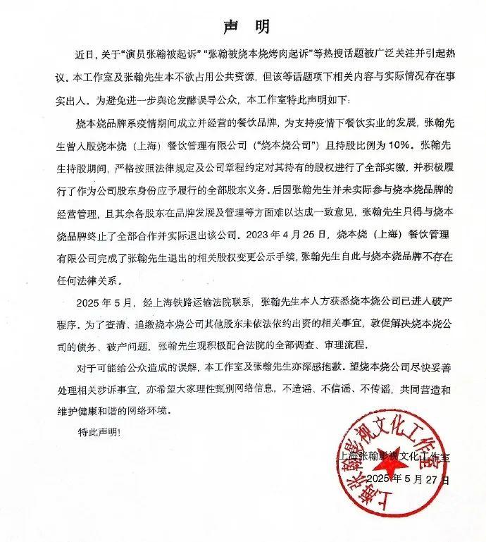 工作室声明称,张翰先生曾入股烧本烧(上海)餐饮管理有限公司(“烧本烧公司")且持股比例为10%,张翰先生持股期间,严格按照法律规定及公司章程约定对其持有的股权进行了全部实缴,并积极履行了作为公司股东身份应予履行的全部股东义务,后因张翰先生并未实际参与烧本烧品牌的经营管理,且其余各股东在品牌发展及管理等方面难以达成一致意见,张翰先生只得与烧本烧品牌终止了全部合作并实际退出该公司,2023年4月25日,烧本烧(上海)餐饮管理有限公司完成了张翰先生退出的相关股权变更公示手续,张翰先生自此与烧本烧品牌不存在任何法律关系。