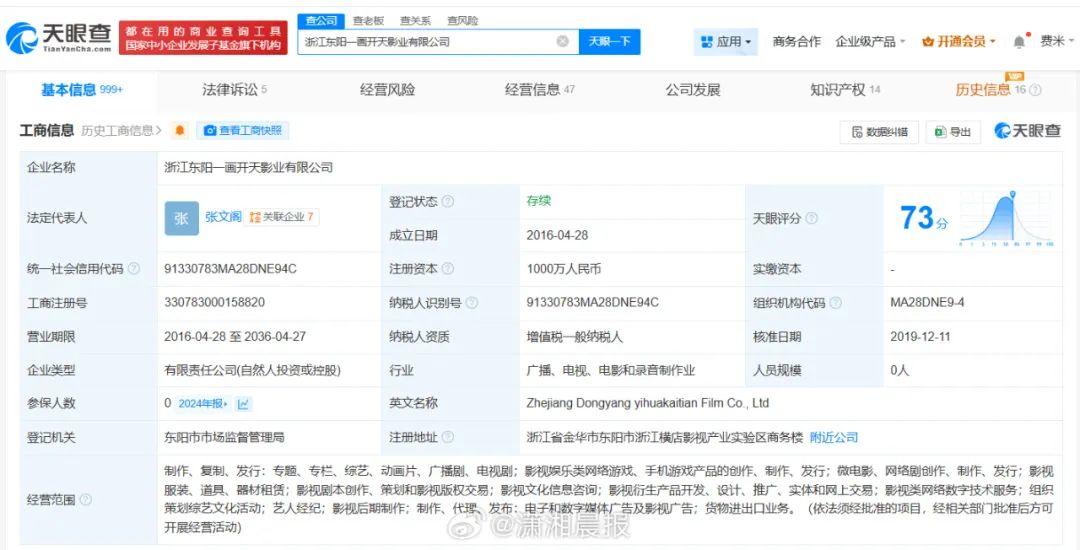 该公司成立于2016年4月,法定代表人为张文阁,注册资本1000万人民币,经营范围包括影视类网络数字技术服务、组织策划综艺文化活动、艺人经纪等。股东信息显示,该公司由张翰、张文阁分别持股99%、1%。
