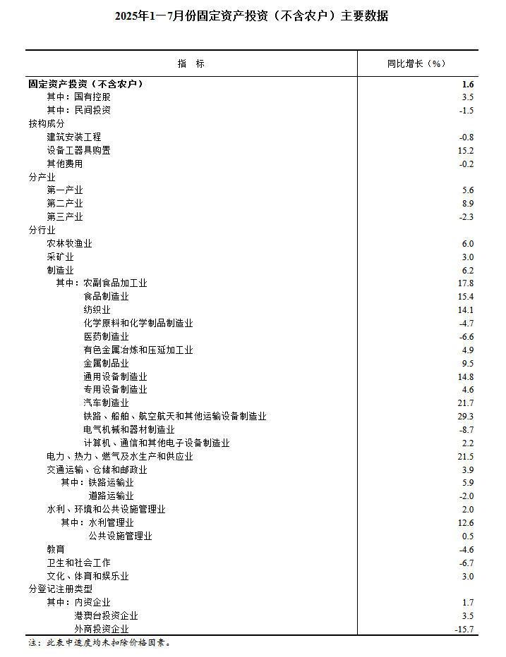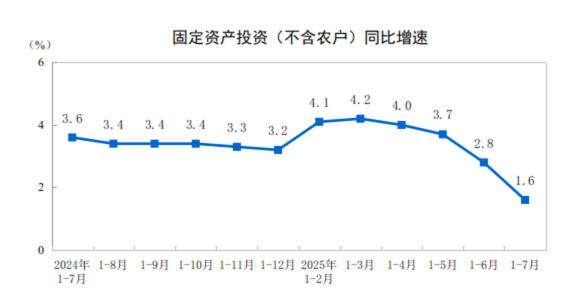 据国家统计局网站消息,2025年1—7月份,全国固定资产投资(不含农户)288229亿元,同比增长1.6%(按可比口径计算)。其中,民间固定资产投资同比下降1.5%。从环比看,7月份固定资产投资(不含农户)下降0.63%。