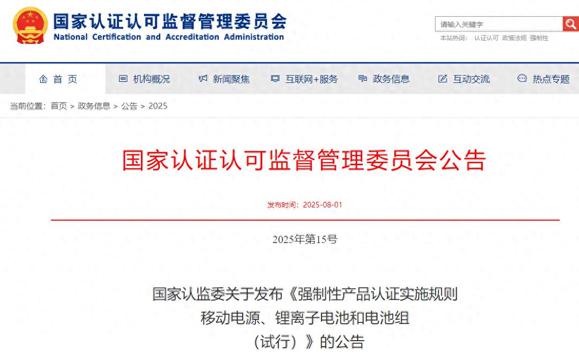 为强化移动电源、锂离子电池和电池组强制性产品认证管理,国家认监委制定了《强制性产品认证实施规则 移动电源、锂离子电池和电池组(试行)》。