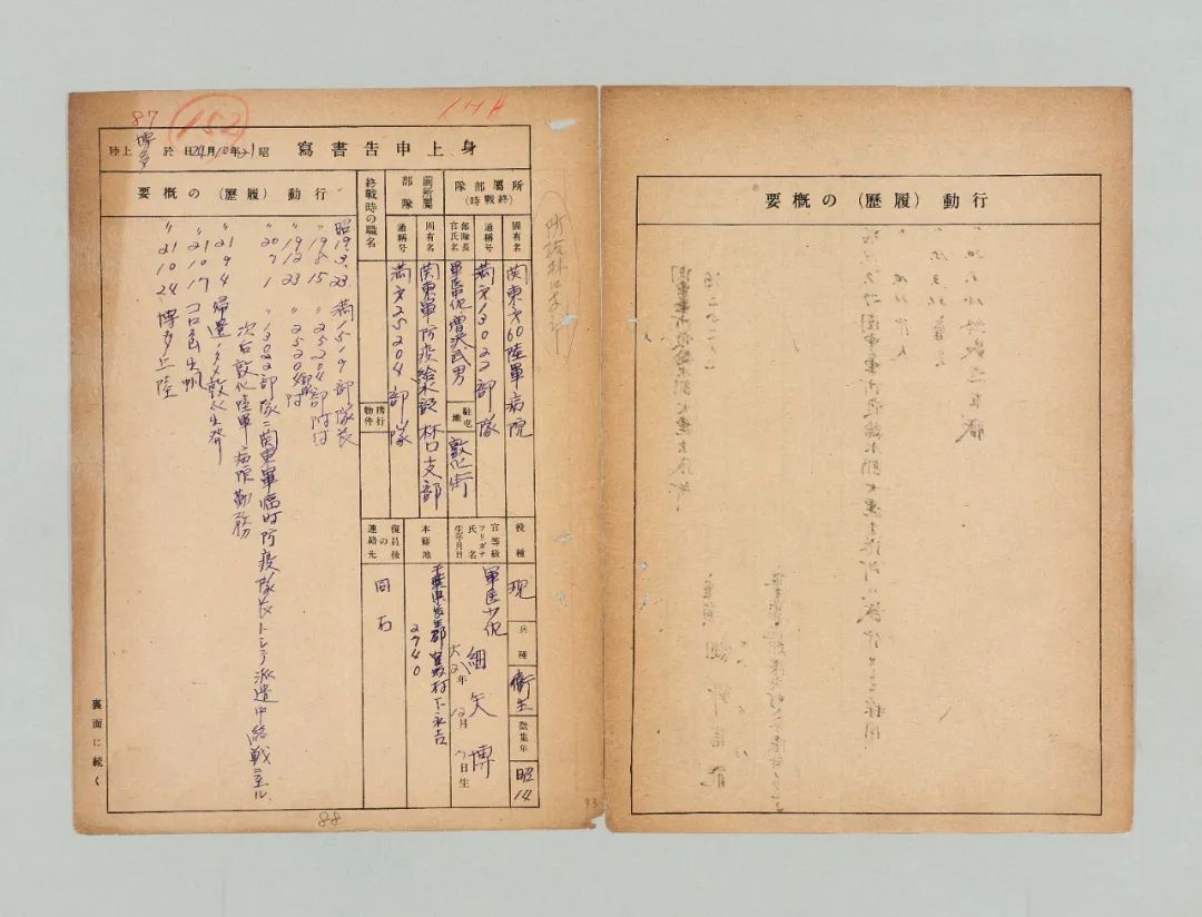 731部队成员细矢博的《身上申告书》(影印件)。(受访者供图)