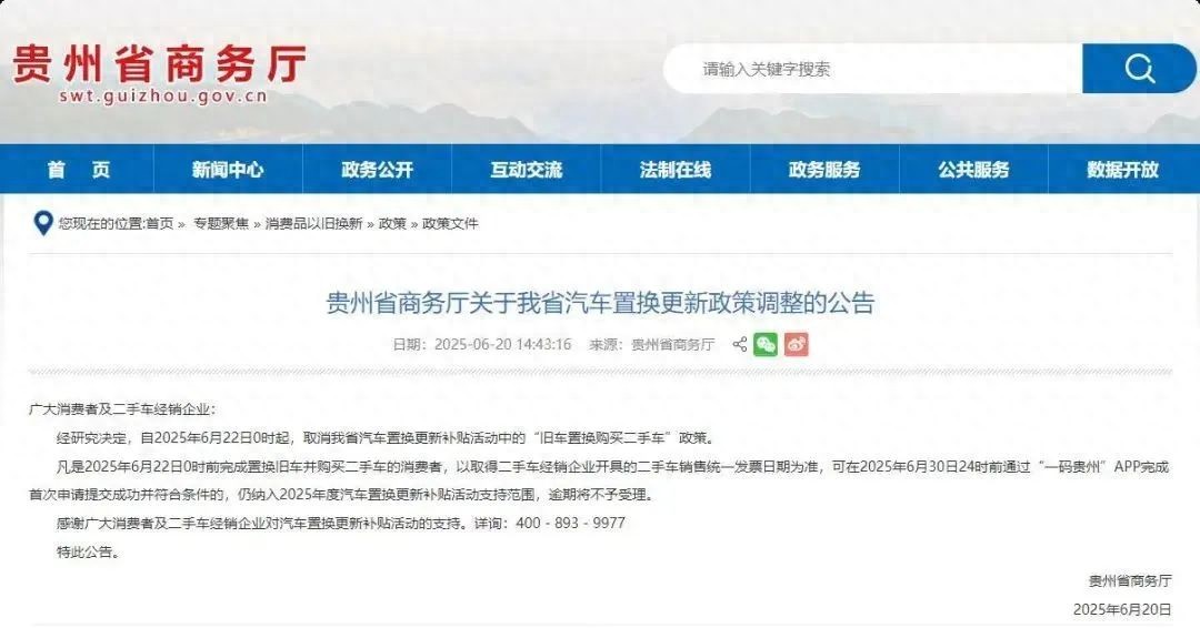 6月20日,贵州省商务厅发布公告:自6月22日0时起,取消该省汽车置换更新补贴活动中的“旧车置换购买二手车”政策。符合条件的消费者可在6月30日24时前提交申请,逾期将不予受理。