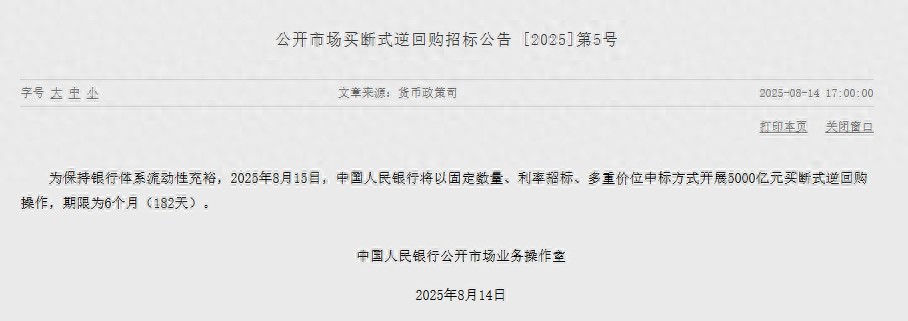 央行网站14日公告,为保持银行体系流动性充裕,2025年8月15日,中国人民银行将以固定数量、利率招标、多重价位中标方式开展5000亿元买断式逆回购操作,期限为6个月(182天)。