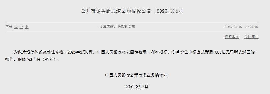 此前,央行网站8月7日曾公告,为保持银行体系流动性充裕,2025年8月8日,中国人民银行将以固定数量、利率招标、多重价位中标方式开展7000亿元买断式逆回购操作,期限为3个月(91天)。