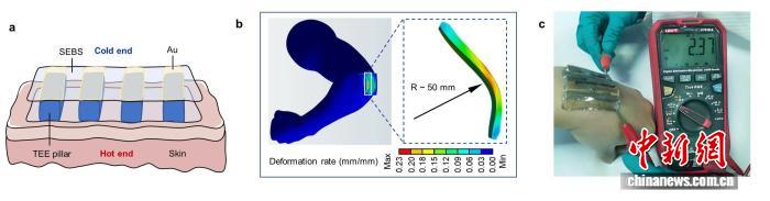 基于上述特点,刘凯依托北京大学雷霆教授团队制造了弹性热电发电机,展现出了驱动可穿戴电子设备和生物传感器的潜力。与无机热电器件不同,弹性热电发电机能够直接与皮肤表面适配,同时保持较高的填充因子和较低的热阻,这使得该器件能够兼具高效的热电转换效率和优异的舒适性、形状适应性,为柔性电子学和可穿戴设备的能源采集技术带来了新的解决方案。