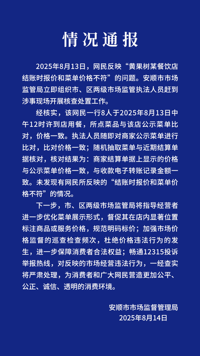 贵州省安顺市市场监督管理局8月14日发布通报:8月13日,网民反映“黄果树某餐饮店结账时报价和菜单价格不符”的问题。安顺市市场监管局立即组织市、区两级市场监管执法人员赶到涉事现场开展核查处置工作。