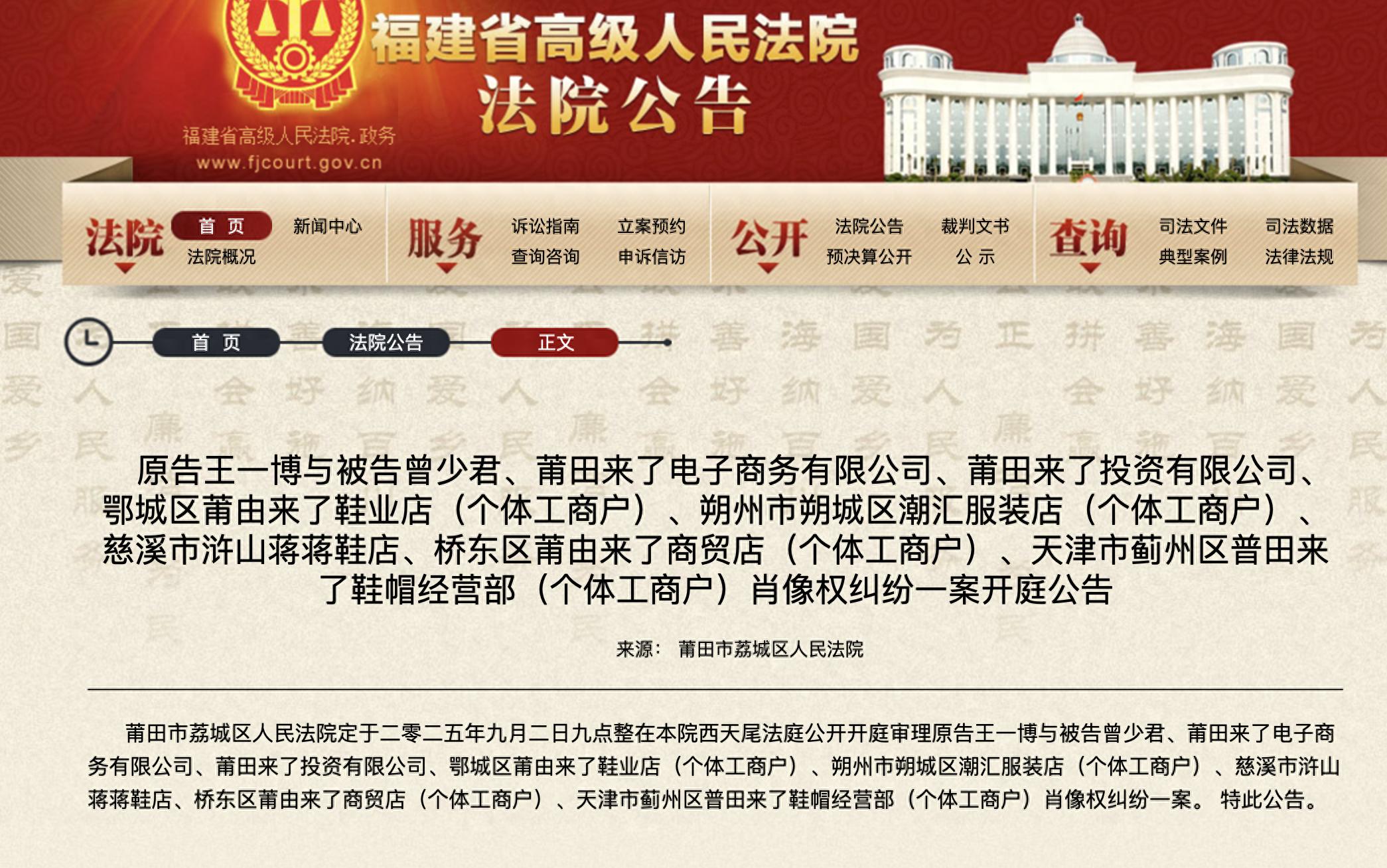 据福建省高级人民法院公告称,原告王一博与被告莆田来了电子商务有限公司、莆田来了投资有限公司、莆田来了鞋业店(个体工商户)等多家企业的肖像权纠纷案件,预计于9月2日在福建省莆田市荔城区人民法院开庭审理。