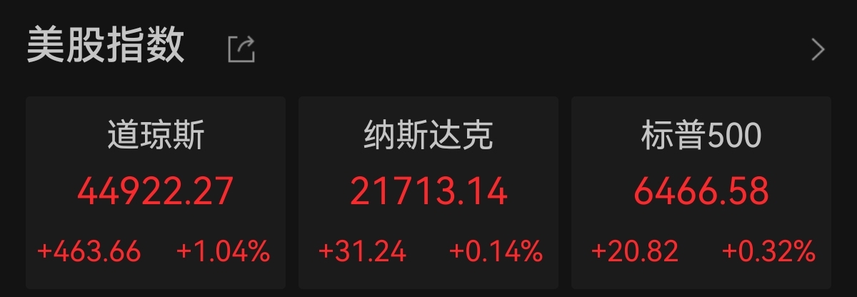 美东时间周三,美股三大指数集体上涨,纳斯达克指数、标普500指数续创盘中和收盘新高。截至收盘,道琼斯工业指数涨463.66点,涨幅1.04%,报44922.27点;纳斯达克指数涨31.24点,涨幅0.14%,报21713.14点;标普500指数涨20.82点,涨幅0.32%,报6466.58点。