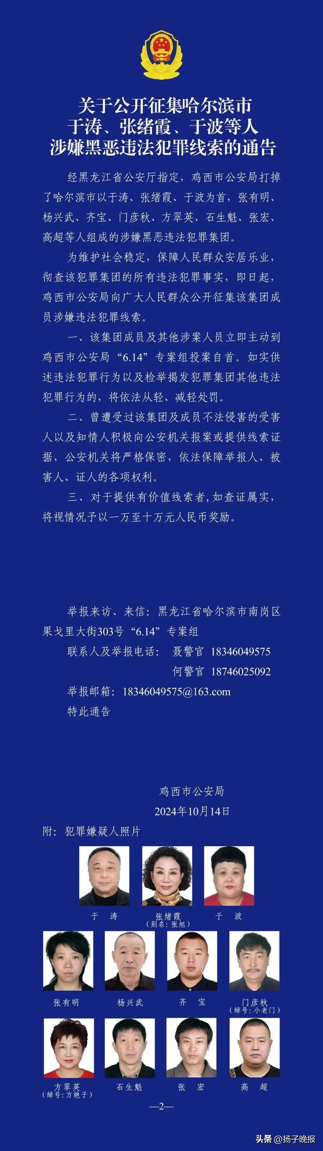 同年10月,黑龙江省鸡西市警方发布通告,公开征集于涛、张绪霞、于波等人涉嫌黑恶违法犯罪线索。