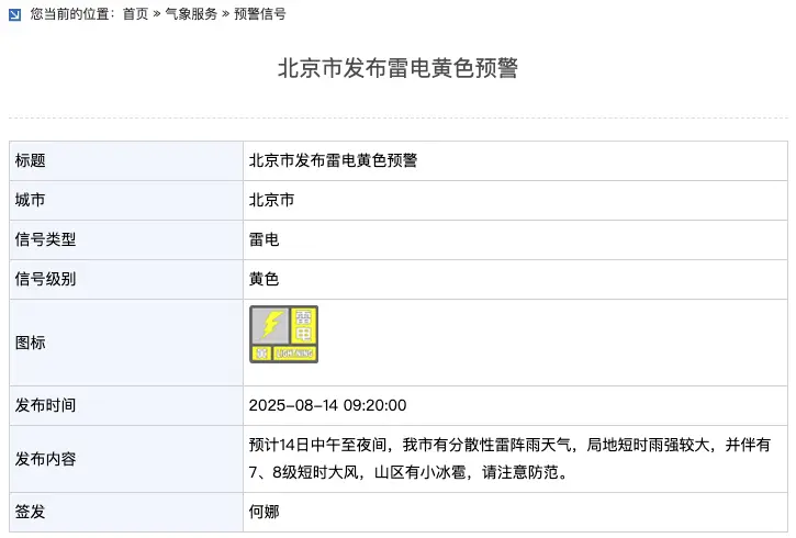 北京市发布雷电黄色预警:预计8月14日中午至夜间,北京市有分散性雷阵雨天气,局地短时雨强较大,并伴有7、8级短时大风,山区有小冰雹,请注意防范。