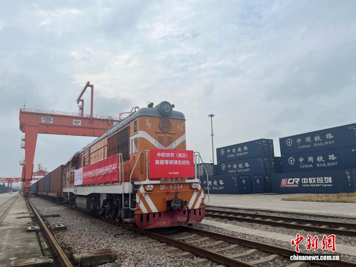 中欧班列(武汉)首趟零碳绿色班列13日从中铁联集武汉中心站鸣笛发车。这也是中部地区开行的首趟零碳绿色班列。