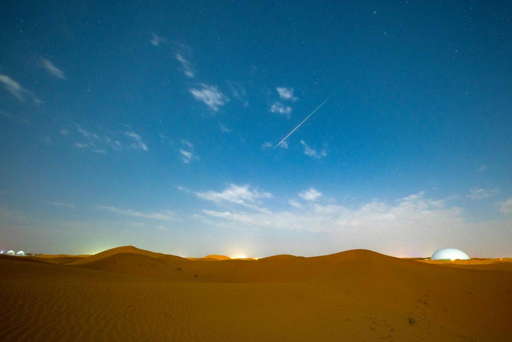 8月13日凌晨,在宁夏沙坡头旅游景区拍摄的英仙座流星雨。(刘兵摄,星联CSVA供图)