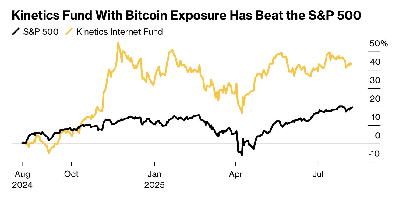以Kinetics Internet Fund(代码WWWFX)为例,数据显示,这只基金过去一年大幅跑赢其基准指数(标普500指数)23个百分点。而该产品管理的3.48亿美元资产中,约有一半都投资于两只由灰度信托基金公司推出的比特币现货ETF,与比特币相关的产品贡献了其总回报的大部分。