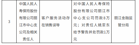 近日,国家金融监督管理总局信息显示,中国人民人寿保险股份有限公司丽江市中心支公司及相关责任人因客户服务活动存在销售误导,被丽江金融监管分局对中国人民人寿保险股份有限公司丽江市中心支公司罚款8万元;对责任人姚亚东给予警告并处罚款1万元。